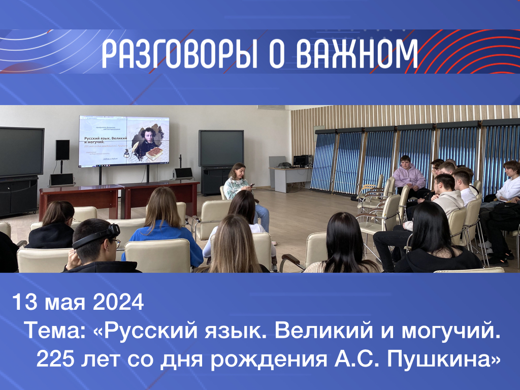 Сегодня в ГАПОУ МО "МЦК-Техникум имени С.П. Королева" проводилось занятие по программе "Разговоры о важном" по теме: Русский язык. Великий и могучий. 225 лет со дня рождения А.С. Пушкина.
